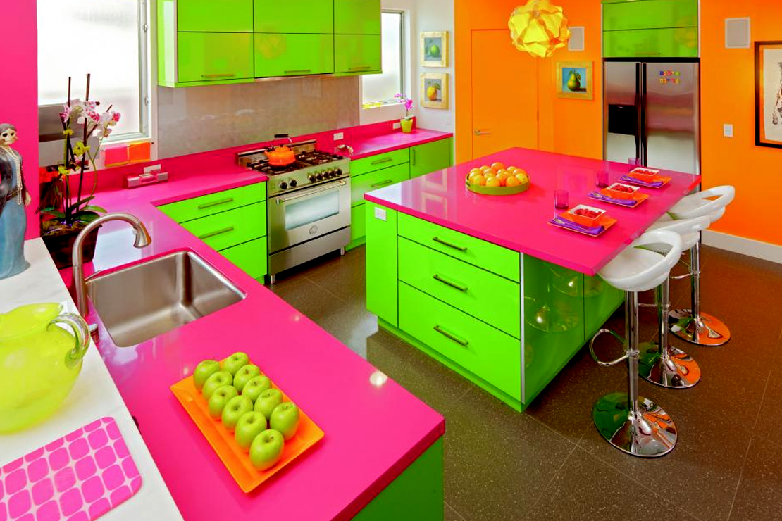 A color combination of radiant green and rose adds an uptown feel, as do chic pattern to your beautiful kitchen room.